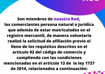 AFILIADO: Comerciante matriculado o inscrito en el registro mercantil con antigüedad de dos (02) años, que previa solicitud voluntaria es aceptado por el comité de afiliación para ostentar tal calidad y ser acreedor a ciertos servicios especiales que la ley y este reglamento le confiere.
