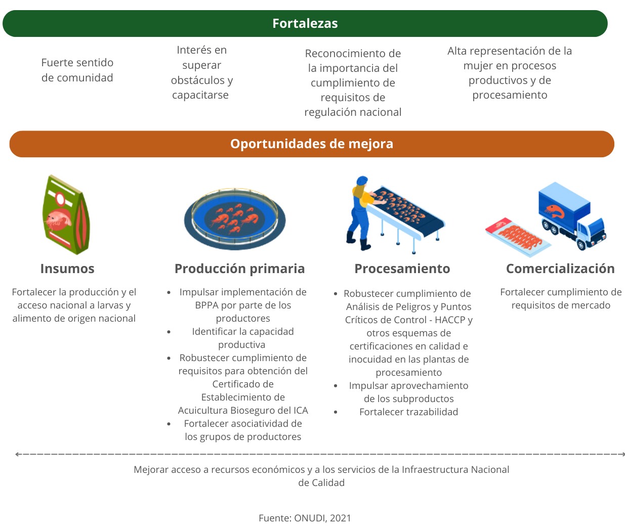Para la cadena de valor de camarón de cultivo en Tumaco se pueden encontrar las siguientes fortalezas y oportunidades de mejora